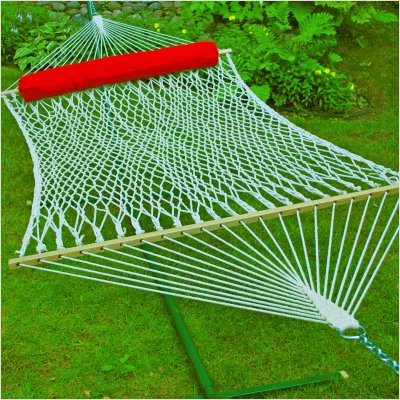 4902CHSP Lay your head down on the soft bolster pillow that accompanies this 100pct natural cotton rope hammock. Not only is it attractive and comfortable it's strong and durable. Use either indoors or outdoors. Either place, you'll enjoy the look, feel, and comfort of this hammock and pillow combination. Features -13' overall length. -Made of 100pct natural cotton rope. -Hardwood spreader bars. -Outdoor plated hardware. -52''x8''x4'' pillow made of weather resistant fabric. -Green and white striped hammock pad made with weather resistant fabric. -Weight Capacity 350 lbs. -Fits model #4780 stand (not included).